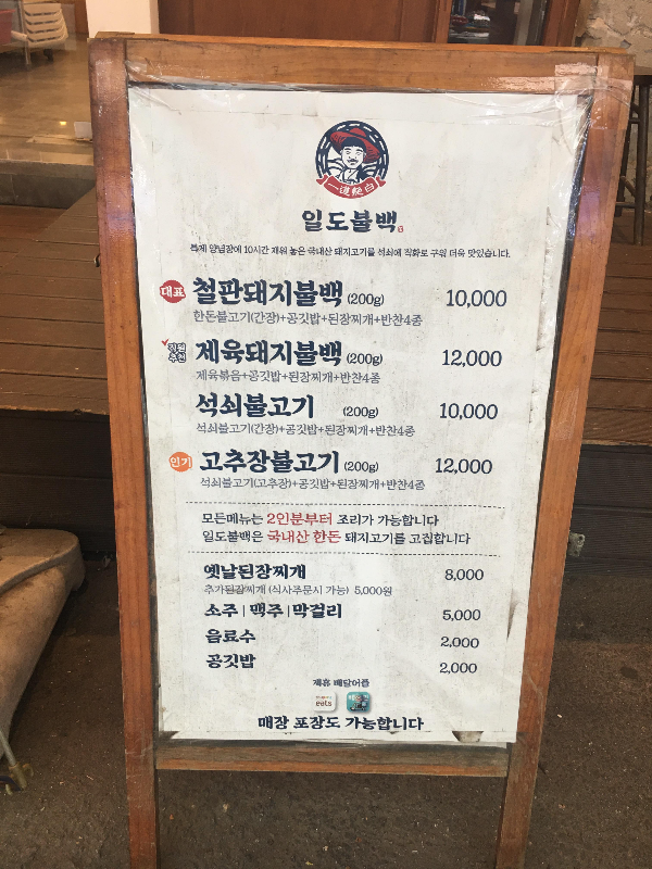 <마천동 일도불백의 간판사진과 직화구이,제육볶음>