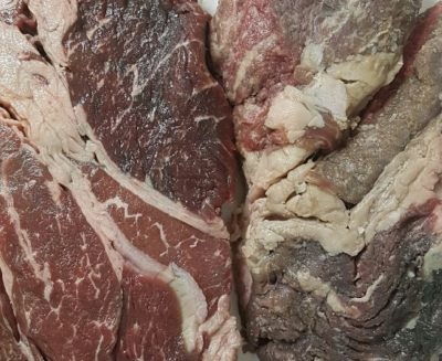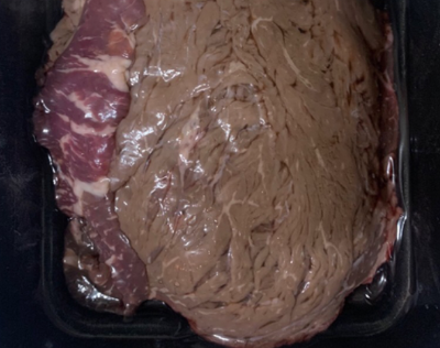 아래 사진은 갈변현상의 일반적인 정상육과 숙성의 단계가 지나쳐 부패의 단계까지 접어든 제품사진입니다.