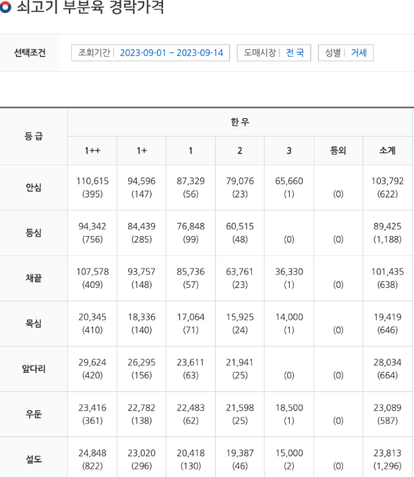 전국 경매시장에서 부분육 거래가격을 9월 1일~14일까지 거세우 기준으로 조사해 보았습니다.