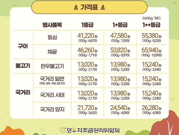 한우판매가격을 보시면 1등급 한우의 등심이 6,870원/100g이고 불고기, 국거리의 경우 2,170원/100g이라고 합니다. 아니 1++ 불고기와 국거리의 가격이 2,540원/100g이면 평상시 1등급에서도 절대 볼 수 없는 폭탄급 가격인 만큼 조기 소진을 대비한 만반의 준비가 있어야 할 것으로 보입니다.
